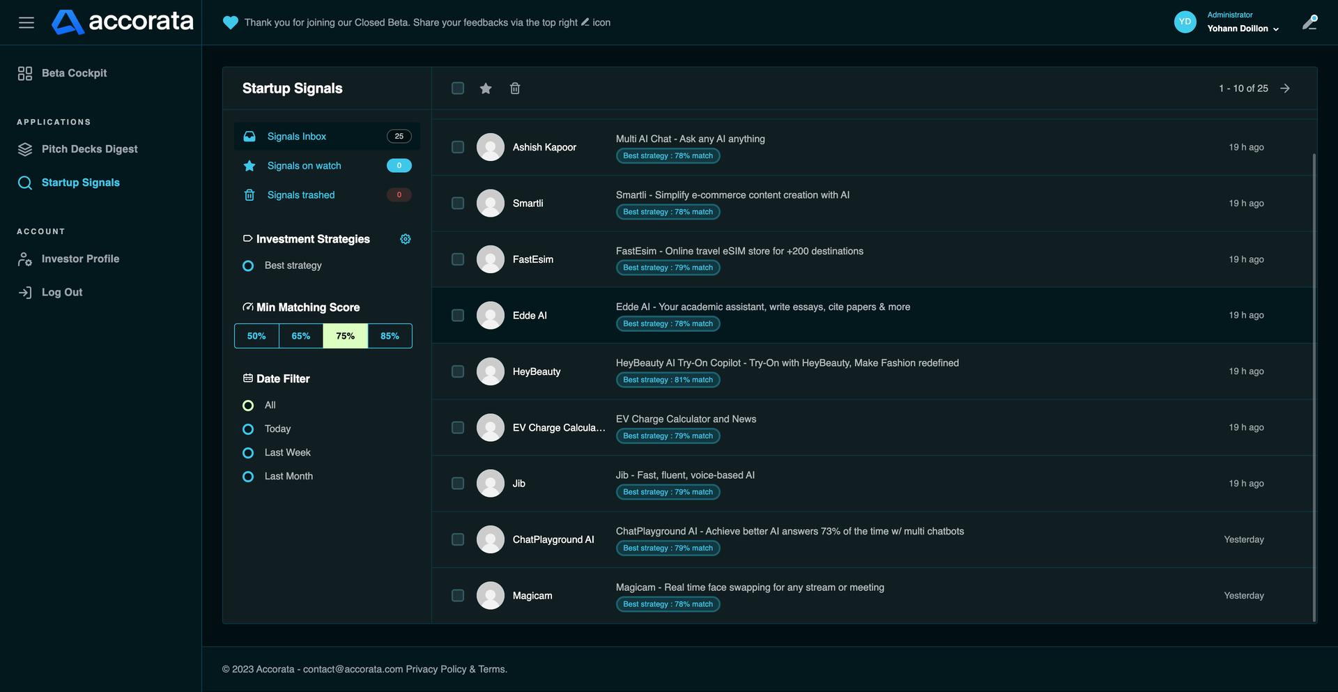 Accorata is a deal sourcing plat for early-stage investors and VCs, helping them find and assess new start-ups matching their investment thesis through LLMs